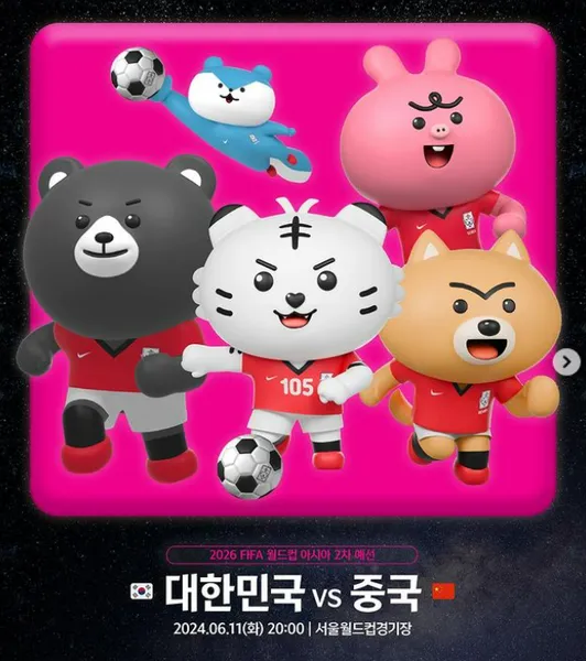 2026 FIFA 월드컵 아시아 2차 예선 중국전은 2024년 06월 11일 있을 예정이며, 경기는 서울월드컵경기장에서 치러질 예정입니다. KFA에 따르면 티켓 예매는 5월 30일 목요일 19:00부터 가능합니다. 아래 버튼을 통해 티켓 예매처로 이동하시기 바랍니다.